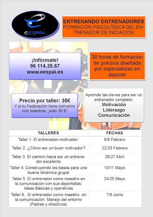El primer taller Entrenador-Motivador se desarrollará los días 8 de Febrero de 16´00 a 19´00 h. y 9 de febrero de 10´00 h a 13´00 h. en los locales del Centro Rendiment Espai Salut en la C/Oltá, 23 (Valencia), y versará sobre diferentes técnicas de motivación aplicadas al pacto de objetivos y metas con los deportistas, ajuste de expectativas y planificación.